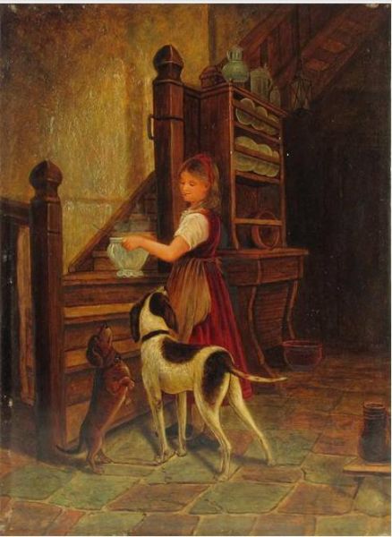 Kleines Mädchen mit Suppenterrine wird von Hunden begleitet.