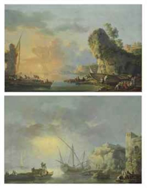 | A harbor at dawn with fishermen embarking from the shore; and A harbor at dusk with fishermen tying up nets and coming ashore | |