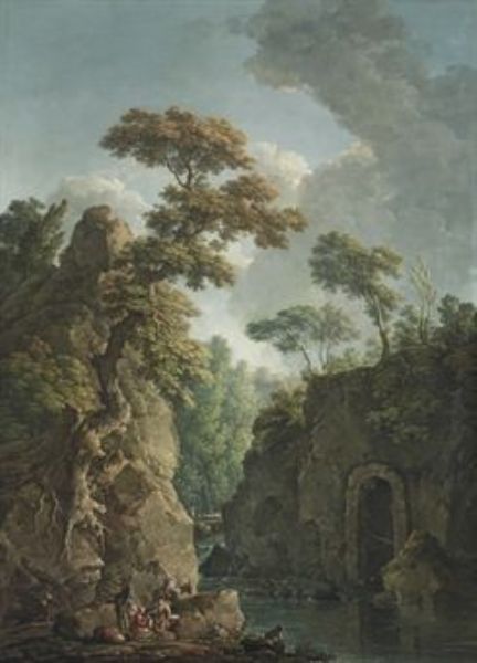 | A mountainous river landscape with drovers resting by the bank, a shepherd with a flock of sheep beyond | |