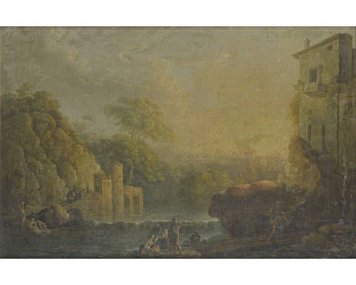 | A river landscape with figures resting on rocks before a waterfall; and An Italianate landscape with travellers crossing a bridg | |