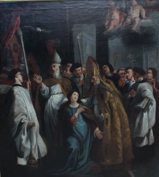 | A church interior with bishops and other clerical figures, a woman on her knees before them, cherubim overlooking | |