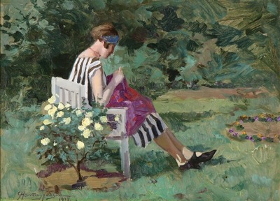 | A woman with her needlework in the garden | |