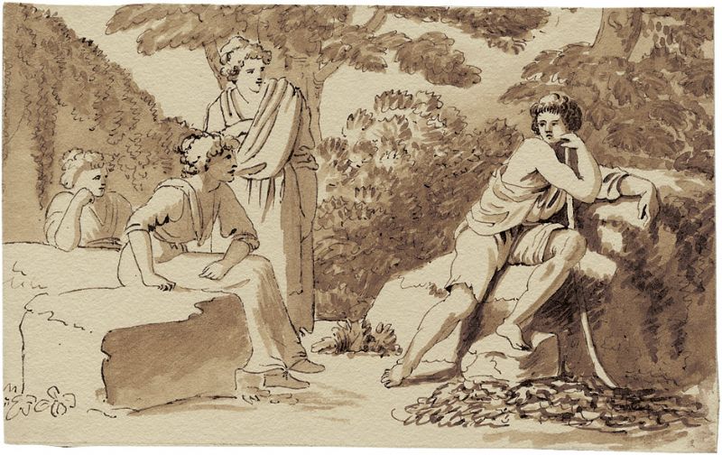 Antikische Figuren in arkadischer Landschaft (Das Urteil des Paris?)