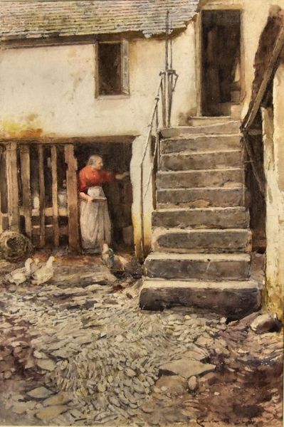 | Courtyard scene with stone steps and a woman feeding ducks to left foreground | |
