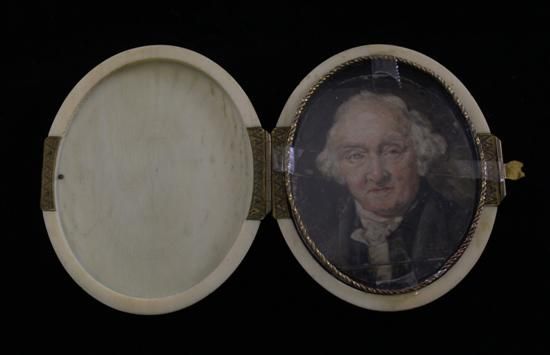 | Miniature of a gentleman, in ivory case, with artist's card and outer leather case | |