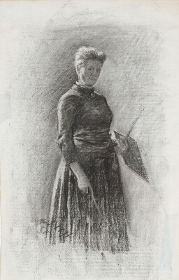 The artist Marie Luplau with her palette. Unsigned. Coal on paper. Visible size 44.5×28 cm. | |