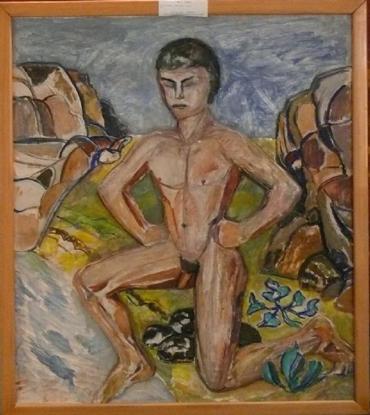 Skuret samt bemålat trä föreställande mansmodell i klipplandskap