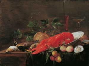 STILLEBEN MIT HUMMER, AUSTERN UND FRÜCHTEN