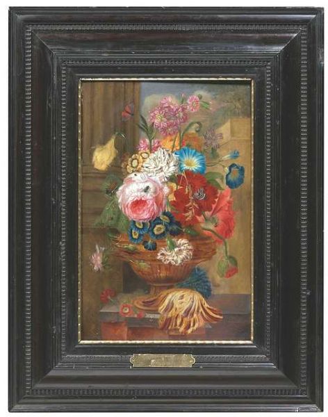 | A still life of roses, tulips and other flowers with insects in an stone vase on a ledge | |