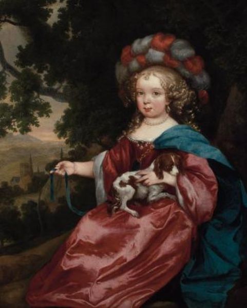 Girl in Festive Dress Holding a Spaniel