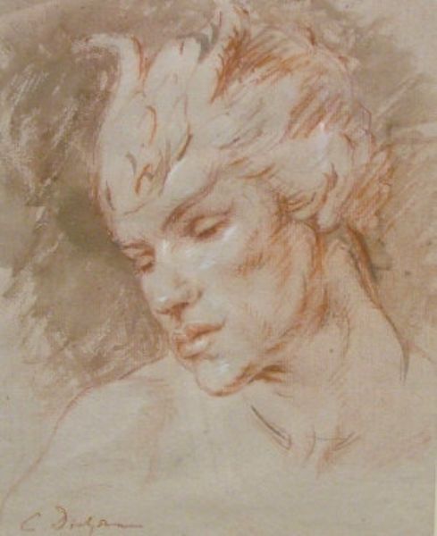 | Chalk red chalk heightened with white chalk, watercolour wash on buff paper | |
