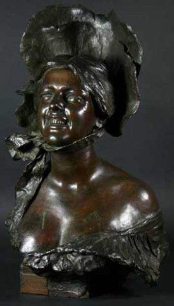 | A Dark Brown Patinated Life-sized Bust of a Young Woman wearing a flamboyant petalled flower head bonnet tied around her chin wi | |
