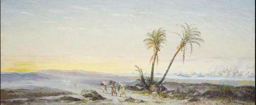 Figures walking into a desert with a harbour in the distance
