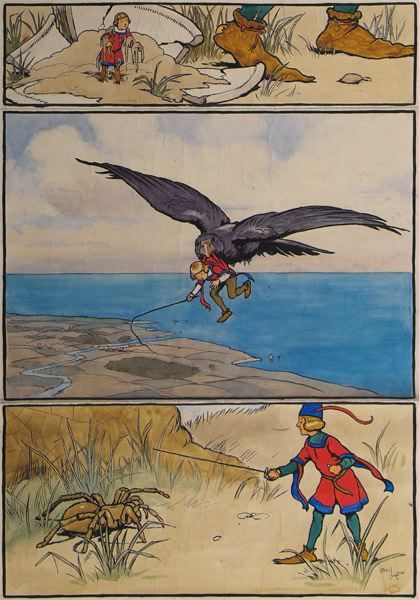 | Escaping in a bowl of porridge; Carried off by a bird; Keeping a spider at bay. | |