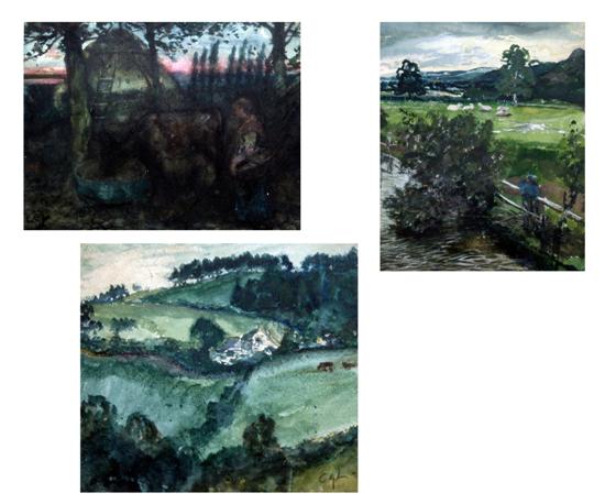 Woman feeding a calf and two landscapes