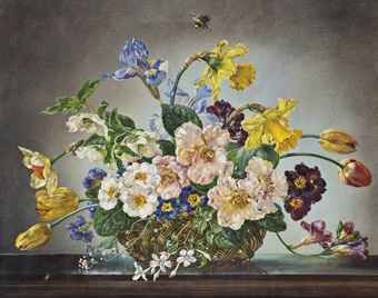 | Daffodils, tulips, irises and primroses in a wicker basket, with a bumble bee overhead | |