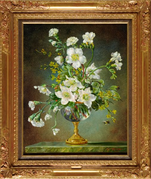 | 'WINTER', A STILL LIFE OF HELLBORES NIGER, CARNATIONS, FREESIA, AND WINTER JASMINE IN AN ITALIAN CRYSTAL AND GILT GOBLET | |