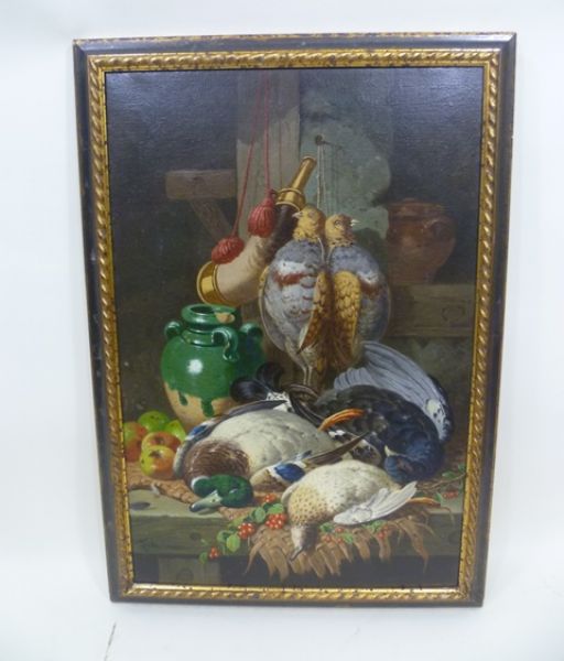 | Still life of dead game, fruit, storage pots and a tasselled horn, on a rush mat with berries and rustic table | |