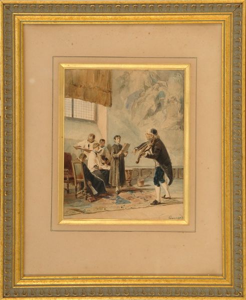 | Interior scene of a man playing a violin, a boy singing and several figures in the background | |