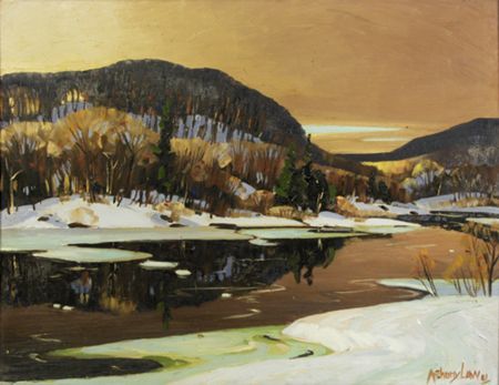 A RIVER WITH SNOW AND WOODED HILLS