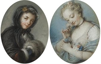 | Une femme en manteau noir avec un manchon: l'Hiver; et Une femme avec une robe bleue et des fleurs dans les bras: le Printemps | |