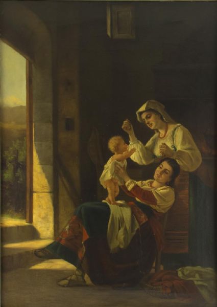 | Zwei Frauen in italienischer Tracht mit dem Stammhalter in ländlicher Küche | |