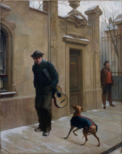 | Un guitariste face à un chien devant un portail d'entrée d'un hôtel particulier | |