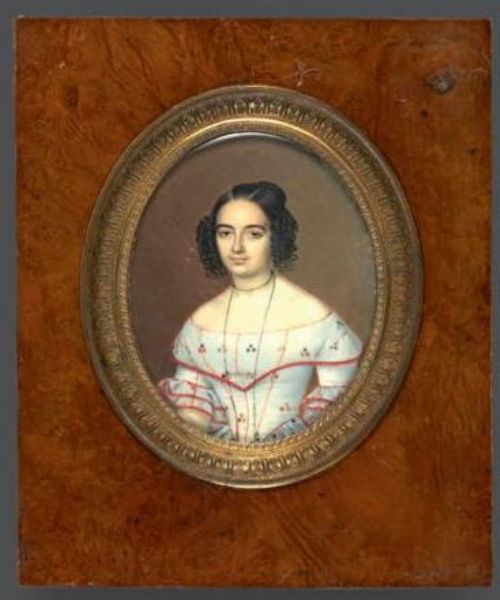 | Portrait d'une épouse de planteur Antillais en robe blanche à liserés rouges, coiffée d'un haut chignon retombant en anglaises | |