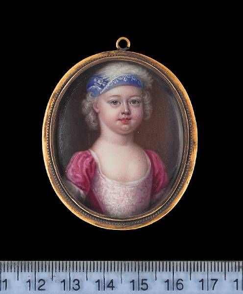 | A child, probably Frederick, Prince of Wales (1707-1751), wearing dress with white embroidered bodice and pink sleeves, a blue c | |