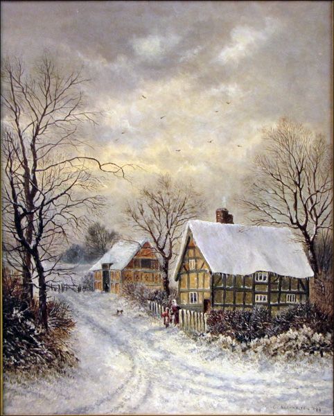 COTTAGES AND FIGURES IN WINTER LANDSCAPE, 1877