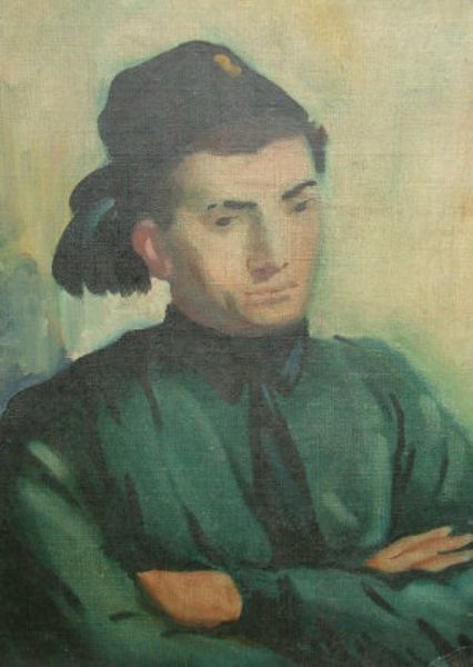 Portrait of man bust length, wearing a blue shirt and hat