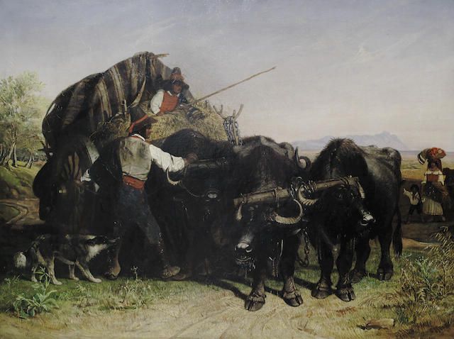 Buffalo cart and peasants of the Pontine Marshes on the road from Rome to Naples