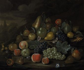 | Still life of pears, peaches, apples, plums, grapes, hazelnuts, and flowers on a bank | |