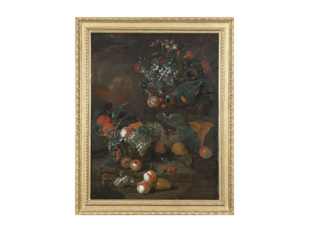 | Still Life with a Basket of Flowers and Two Parrots on Steps | |
