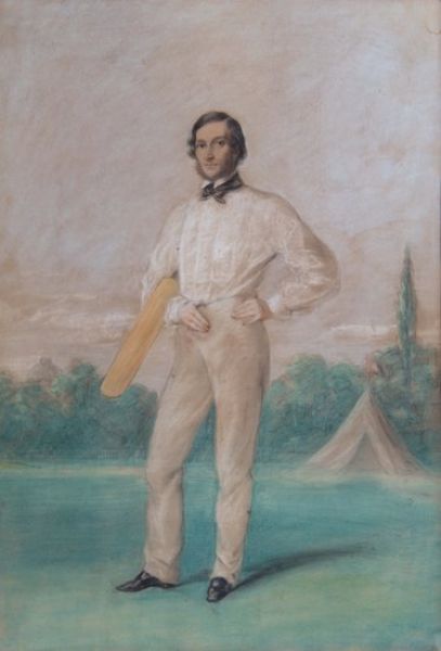 | Full length Portrait of a Cricketer Standing on the Pitch with Tent and Woodland behind | |