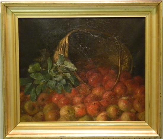 | still life of spilled basket of apples with cluster of foliage to the left, extremely dark background | |