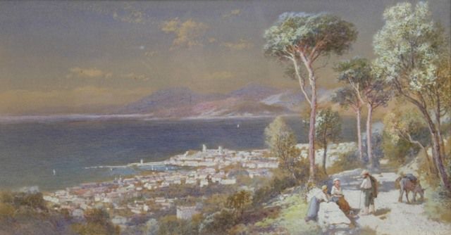 | A view of Mediterranean shores highlighted in white being a view of country folk on a path with Cannes in the distance | |