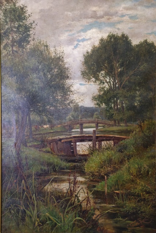summer landscape with stream, bridges, and cows