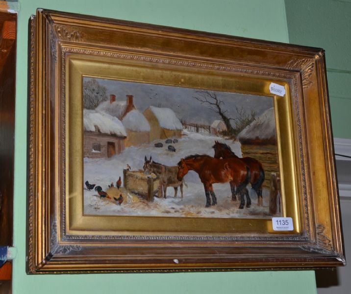 | horses and donkey and chicken feeding in a winter farmyard | |