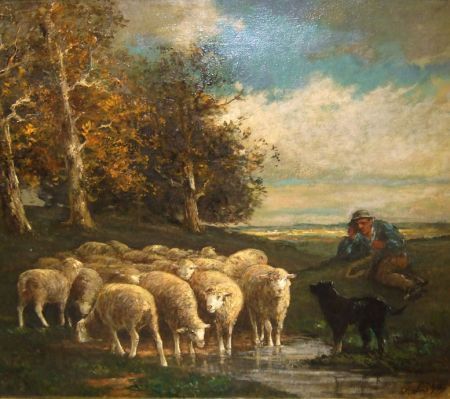| Young Shepherd Boy resting on a Hillock, Dog Watching Sheep Watering | |