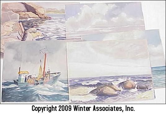 | marine themed works including a fishing scene, a harbor scene, three ship's portraits, and five seascapes | |