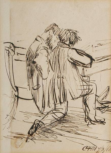 | Figures, believed to be William Morris and Edward Burne-Jones, crouched at a drawing table | |