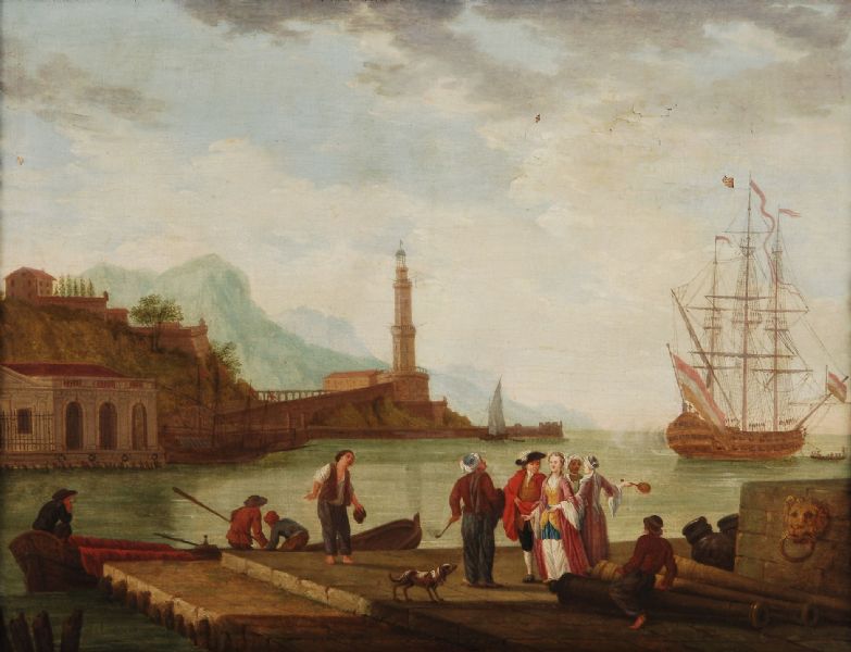 Figures at a Mediterranean port, with a lighthouse beyond