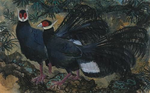 | Tibetan pheasants (Crossoptilon harmani) in the undergrowth | |