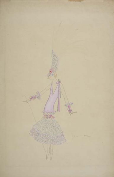 [CHORUS GIRL IN BLUE AND SILVER FILIGREE GOWN.]