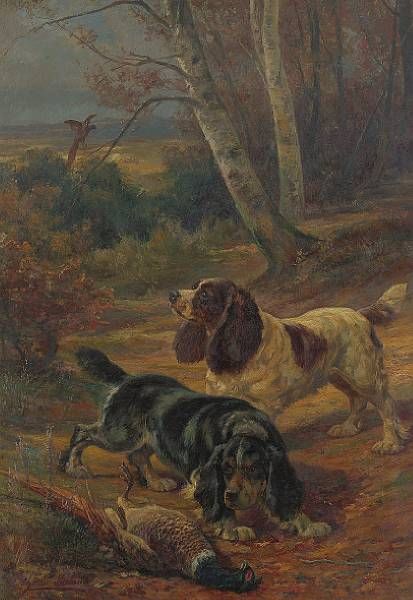 Spaniels catching a pheasant