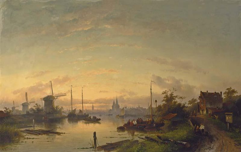 | A RIVER SCENE AT DUSK, WINDMILLS IN THE DISTANCE | |