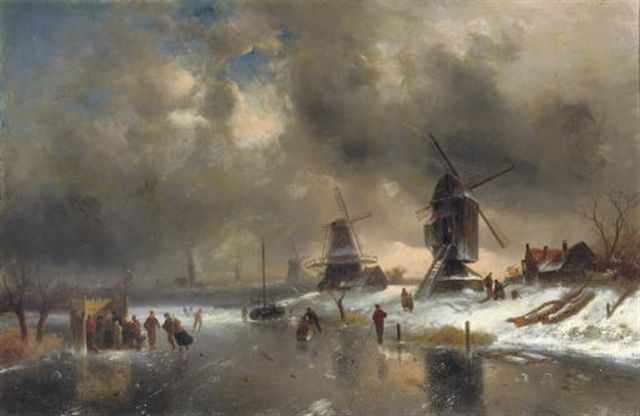 | Windmills along a frozen waterway with a 'koek en zopie' | |