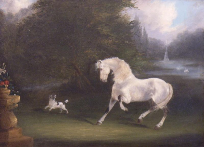 | A grey Horse and Dog in a Parkland; and A chestnut Hunter and Dog in a Meadow | |