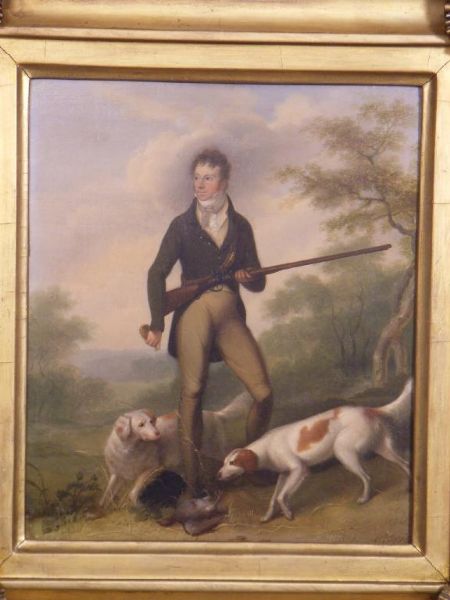 | Portrait of a Sportsman, with his Dogs, a wooded Landscape | |